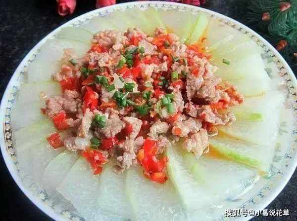 肉末燉冬瓜做法:1、冬瓜洗凈,去皮,切成約2毫米厚的薄片,大蒜、小蔥分別切碎;