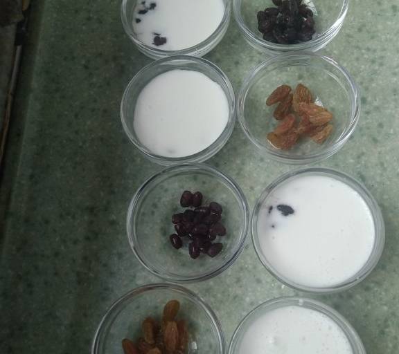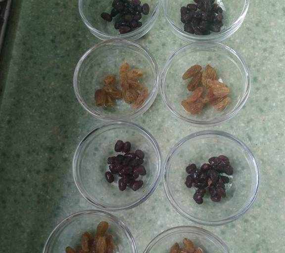 第9步、玻璃碗中放入葡萄幹和蜜豆,蜜豆是買的。