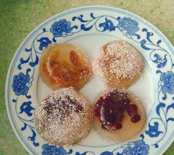 原料:缽仔粉、開水、白砂糖、蜜紅豆、葡萄幹。