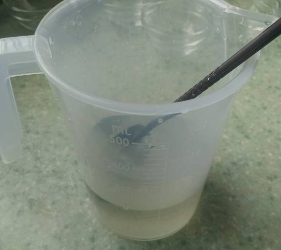 第3步、用量杯量取150毫升溫開水,裝入攪拌杯中。
