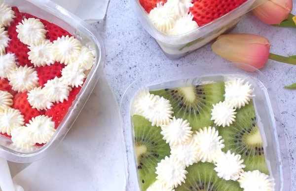 4.然後一層蛋糕片,裱花袋裱一層奶油,再蓋一層水果。完工!