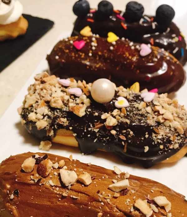7.在泡芙表面,用毛刷刷一層巧克力淋面,再用巧克力線條裝飾即可。