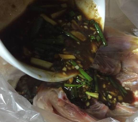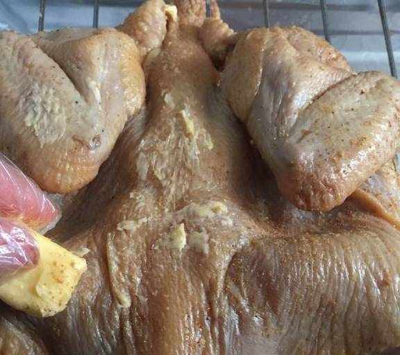 第4步、切開的肚子面朝上,把全部醃料倒進去。讓醃料自然流到雞後背,再把雞翻個身,用手把醃料均勻地抹一遍(帶上一次性手套哦)。
