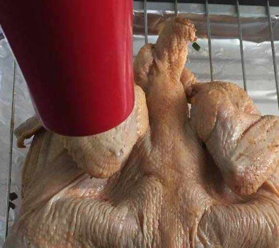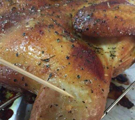 第11步、檢驗是否烤熟:拿根牙簽插進雞大腿,牙簽拔出來沒有血水,是幹凈無殘留的就可以瞭。