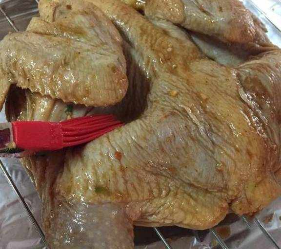 第6步、將醃好的雞拿出來,烤盤上鋪一張錫紙(可以不用洗烤盤),上面放烤架,把雞按平,讓雞平著趴在烤架上。用刷子刷掉雞身上的醃料(經過幾個小時,雞肉已經入味)。