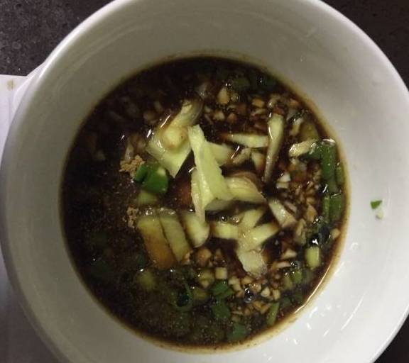 第3步、準備醃料:蔥切成蔥段,薑切成絲,大蒜剁成蒜末,和配料中的所有調味料混合均勻(不要放鹽,因為這些調味已經夠咸瞭)。(配料中的勺子是用的傢裡普通瓷的那用小湯匙,一平勺大概是7克左右),可根據個人口味增減調料。