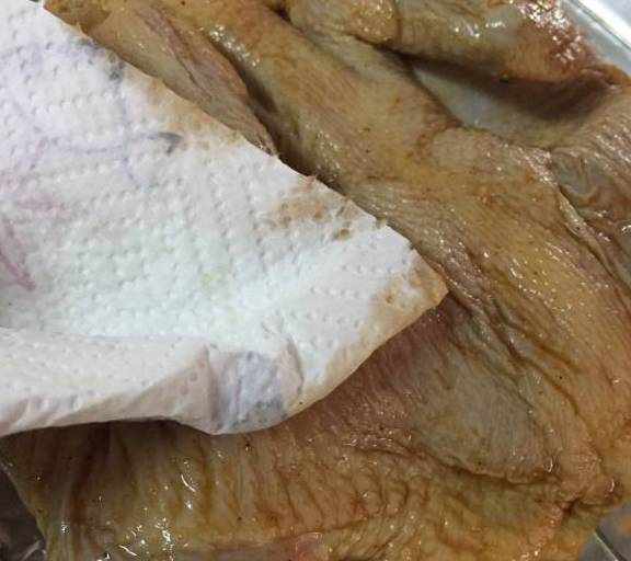 第7步、用廚房專用紙巾吸幹雞身上的醬汁。