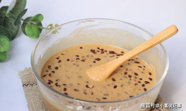 3、糯米粉和粘米粉混合好後,倒入紅糖水,攪拌成細膩的面糊。然後加入蜂蜜紅豆。攪拌均勻。