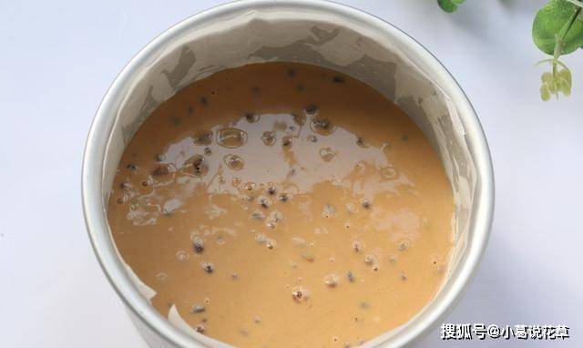 4.我用的是6寸的蛋糕盤,底部和邊緣都墊瞭防油紙。倒入面糊中