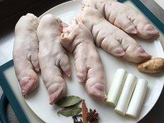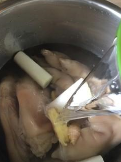 用料:豬蹄三隻、大蔥半根、薑一塊、八角兩個、桂皮一小塊、丁香幾粒、香葉兩片、食鹽適量、料酒適量