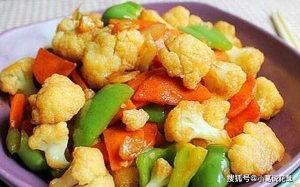 1.花菜洗凈切小塊,蒜切碎,青紅椒切丁或條備用;
