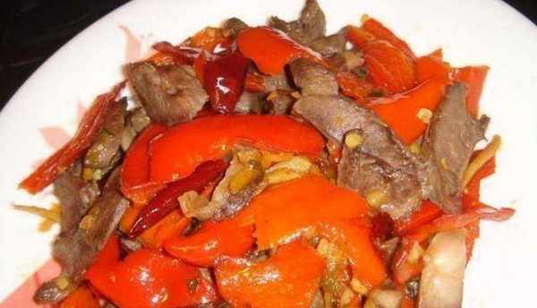 5、鍋裡放油燒熱,放入辣椒和大蒜翻炒片刻,然後倒入豬心,加入辣椒粉、鹽和味精。