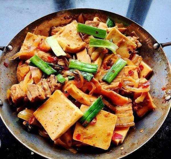 3、然後加入郫縣豆瓣炒香,倒入千片豆腐;繼續炒至豆腐上色;