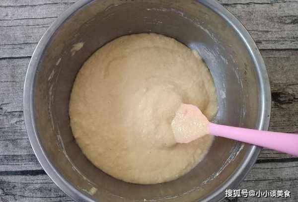 3、將小米粉倒入一個大碗中,加入100克開水(剛煮開的熱水)用鍋鏟快速拌勻,將小米粉煮熟。