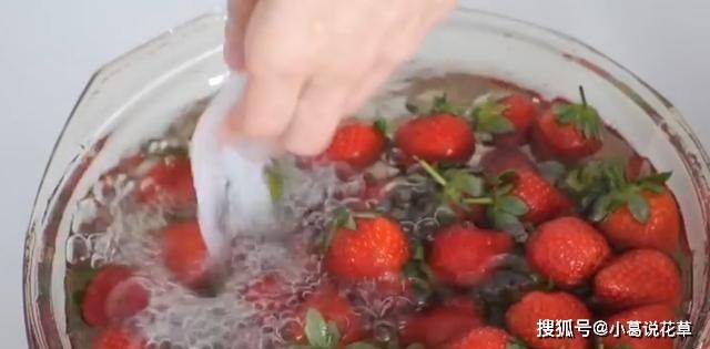 將剛買來的草莓用清水洗凈,輕輕洗3-4次。草莓泡水會爛掉,所以要盡快洗凈,瀝幹水分。