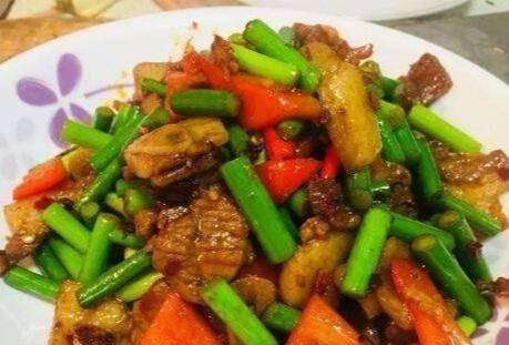 8.加入蒜苗和辣椒,翻炒兩三分鐘。