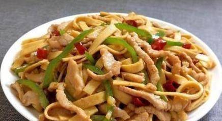 3、然後加入豆腐花和青椒絲,用大火快炒。期間根據個人口味加入適量的鹽、生抽、味精,炒至順滑即可出鍋。