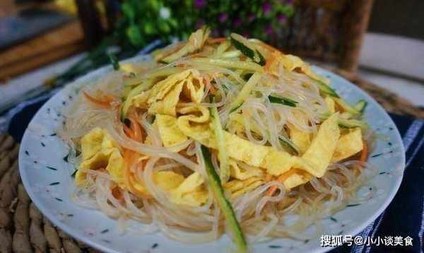 材料:粉絲1條、雞蛋1個、黃瓜1條、胡蘿卜1根、生抽3勺、醋2勺、白糖1勺、香油少許