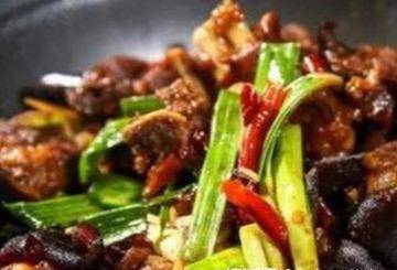 3、鍋中放少許香油燒熱,放入羊肉塊、辣條、青紅椒炒香,加鹽、雞精、味精炒香後放入幹鍋,撒上歐芹,我們上桌。