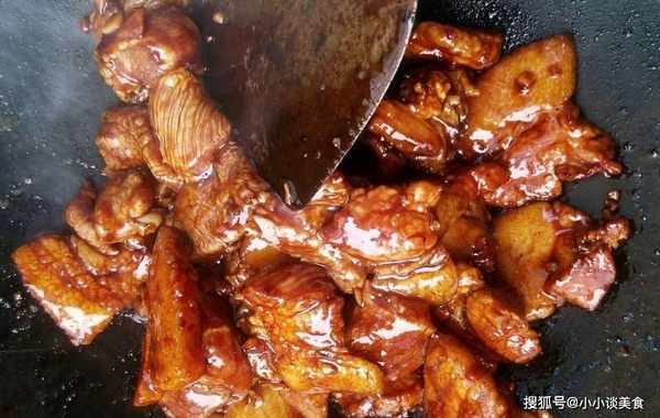 之後繼續小火攪拌糖色,不一會兒就會變成焦糖色。在此期間,必須將要上色的菜肴放入鍋中並快速煎炸。註意當糖色炒到焦糖色時,會稍微變黑變苦。炒菜的時機一定要掌握好。
