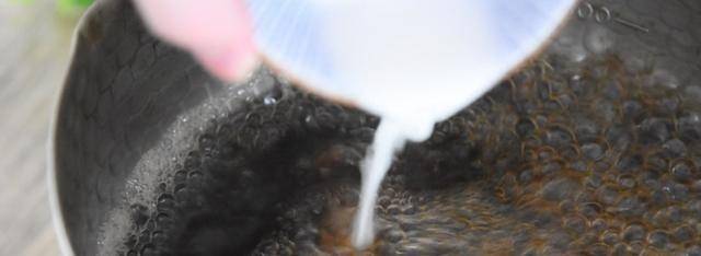 9、取一壺牛奶,預先倒入紅糖水,加水加入紅糖20克和淀粉10克至濃稠。