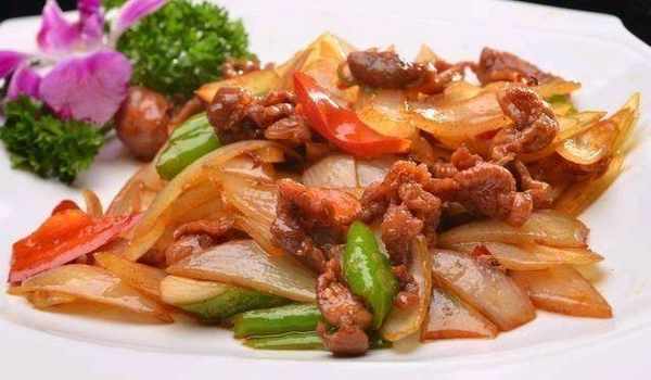 原料:豬肉200克,洋蔥150克,青椒1個,紅椒1個,蔥2段,色拉油1勺,味精1/2茶匙