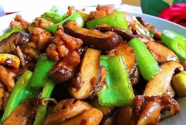 5.加入雞塊快速攪拌至雞塊變色,然後加入栗子攪拌。雞塊和栗子煮熟後,加入預凍的香菇、醬油上色,最後加入青椒翻炒均勻,加入少量雞高湯即可食用