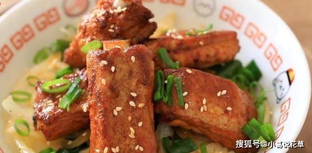 剛好是午飯時間,正在烤排骨,香味誘人。排骨表面微焦。我準備瞭一碗米飯,裡面放瞭炒洋蔥。加入烤排骨,撒上少許白芝麻和蔥花,就可以吃到超簡單又美味的烤肉飯瞭。