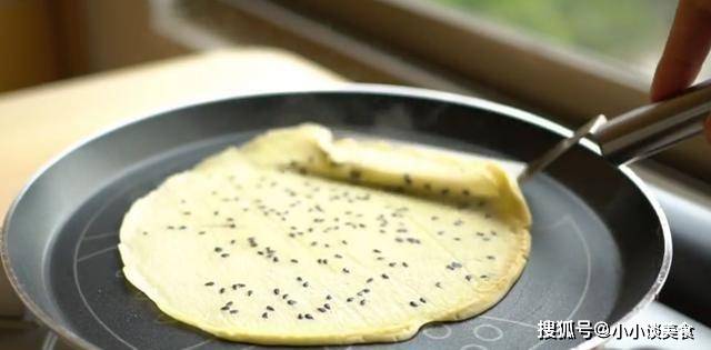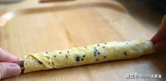 5、鍋熱後,用筷子把餅皮搟開。搟蛋的動作要快,以免餅皮涼瞭脆瞭不容易搟。在取出筷子之前,讓滾好的雞蛋稍微冷卻一下。如果蛋卷不幹不濕,可以放入烤箱150度烤10分鐘。