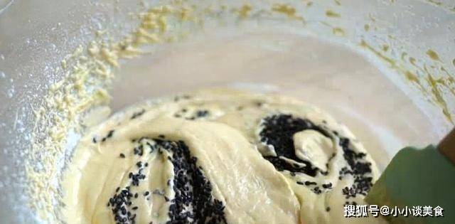 2、奶油完全打發後,加入100克低筋面粉,用打蛋器攪拌均勻,加入15克黑芝麻攪拌均勻,這樣打雞蛋的面團就飽滿瞭。