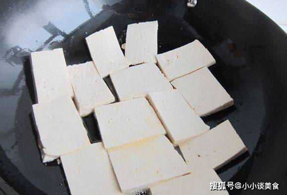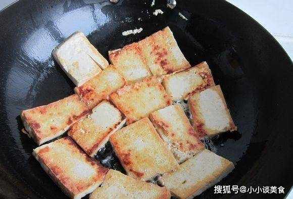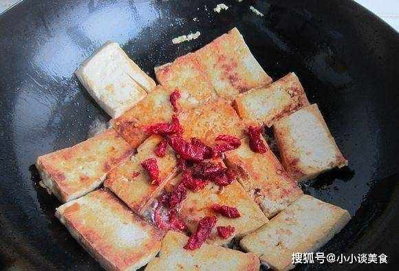 8、加入炸好的麻辣皮豆腐、少許鹽和少許水,稍微拌勻調味。