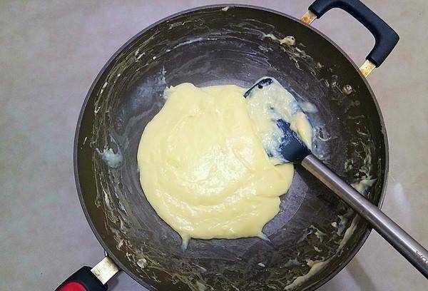 8、將煮好的厚面團倒入預塗油的平底鍋中,搟成1.5厘米厚的長方形。