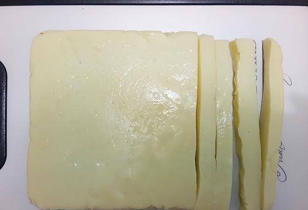 9、冷卻後,放在案板上,切成1.5厘米見方,5厘米長的條狀。