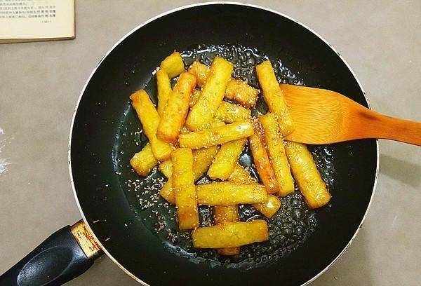 14.待糖汁炸到大泡泡翻出魚眼泡時,放入炸好的糕棒快速拌勻,讓糖汁包裹在糕棒上。同時,在上面均勻撒上芝麻即可食用。