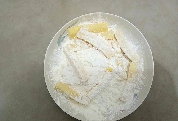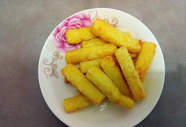 11、燒開食用油,將裹好淀粉的糕條一根一根放入熱油中炸至表面金黃,如果外殼變硬,撈出檢查油。
