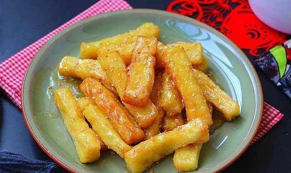 烹飪技巧:1、調面團的時候加少許水,攪拌至光滑。如果沒有小塊,繼續加水,直到面糊變稀沒有小塊。2.為瞭讓面團更均勻,可以過篩兩次。3、和面糊的時候不要心急,小火慢慢熬,還要不停的攪拌,以免粘鍋。4、將煮好的厚面團倒入鍋中,鍋內要事先抹上一層油。5、炸的時候油一定要幹凈,這樣炸出來的糕棒才會保持黃色和光澤。火候要大,油要熱,炸的殼要硬,不能軟。6.待糖漿炒至起泡,魚眼泡翻面時,放入炸好的糕棒快速拌勻。