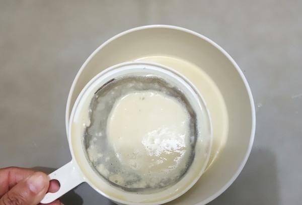 6、將鍋中剩餘的450克水燒開,再次攪拌稀面團,慢慢倒入鍋中用手勺邊攪拌邊漂洗。