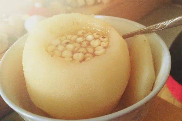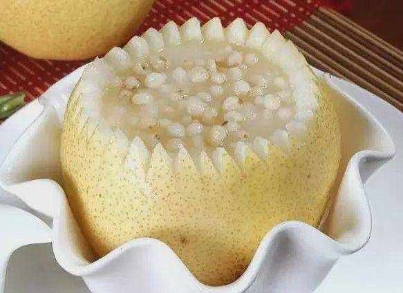 首先,選一個雪梨洗幹凈,將頂部橫切1/5左右,用勺子去核,將川貝和冰糖放入梨中,將切掉的“梨蓋”蓋上並用牙簽固定,加水適量,隔水燉煮30分鐘。吃梨喝湯,每日1次,連服3~5天。