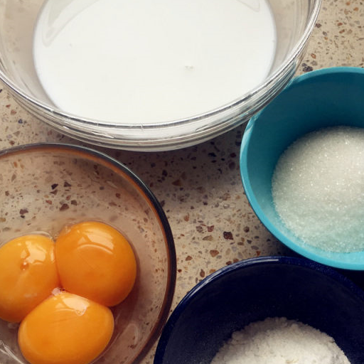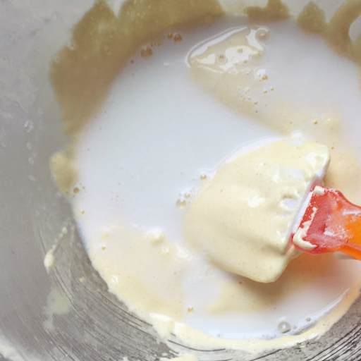 第7步、煮到沸騰的牛奶離火,分次加入蛋黃裡,每次都拌勻再加餘下的。