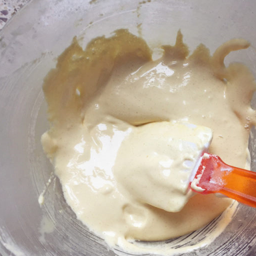 第16步、一直到蛋液和面糊完全融合,提起攪拌用具,面糊會成一個倒三角形,不會滴落的狀態,面糊就做好瞭。