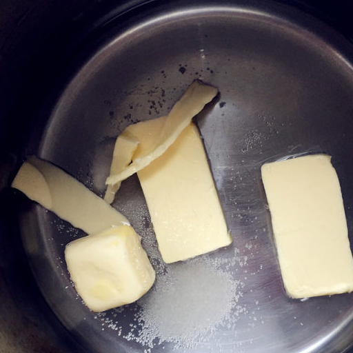 第13步、將黃油,鹽,細砂糖放鍋裡,中火加熱至黃油融化沸騰。