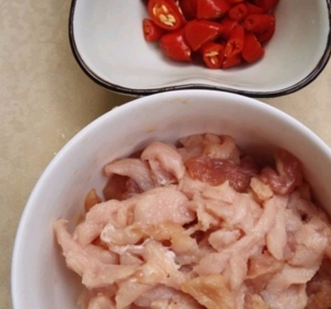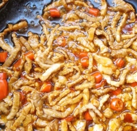 4.熱油鍋,加入辣椒,豬肉,醬油炒熟