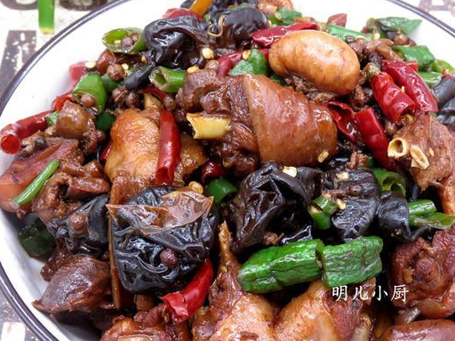 材料:大公雞一隻木耳蔥薑花椒八角幹紅辣椒青椒油鹽老抽醋料酒雞精