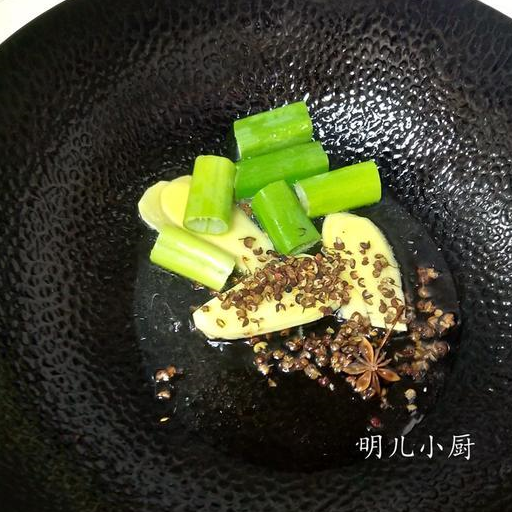 2遵循熱鍋涼油,小火放入蔥薑,花椒,八角炒香。