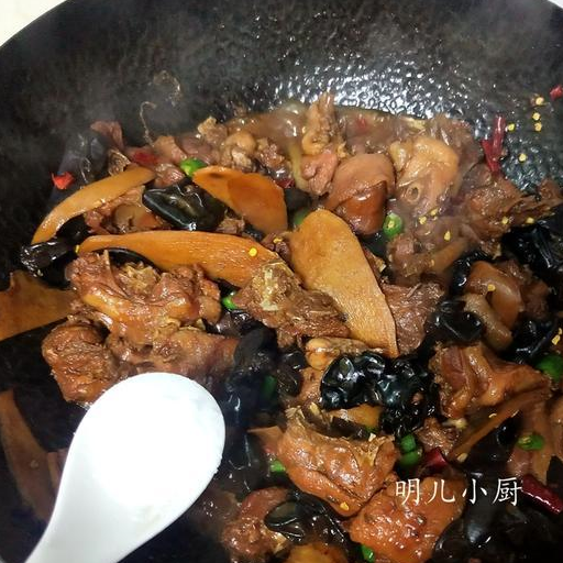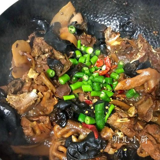 5燉大概一個半小時左右,雞肉才會有九分熟。這時放入泡發的木耳,炒三五分鐘後,放入幹紅辣椒圈和青椒圈。