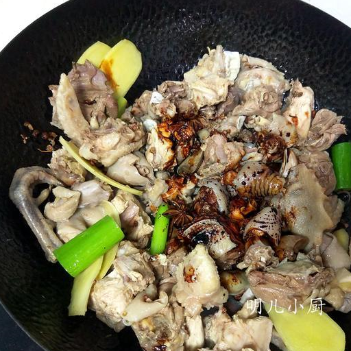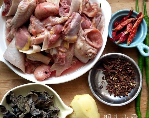 做法:1首先大公雞宰殺洗凈,剁成小塊,涼水下鍋煮至開鍋關火,再用涼水沖洗幹凈,這樣可以很好的去除雞肉本身的血水,就是去腥的關鍵。木耳提前泡發,其餘輔料備好。