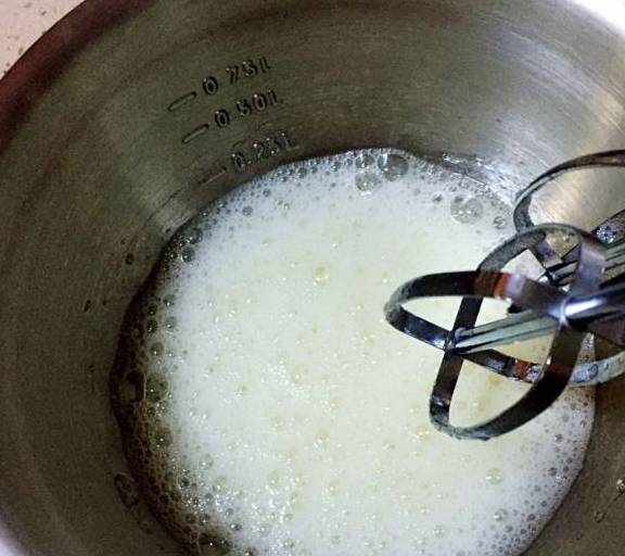 第13步、將奶油冷藏12小時以上後,倒入無水的容器,加入細砂糖30克,用電動打蛋器打發。因為奶油在低溫下易打發,所以我一般在容器下面墊冰水打發。