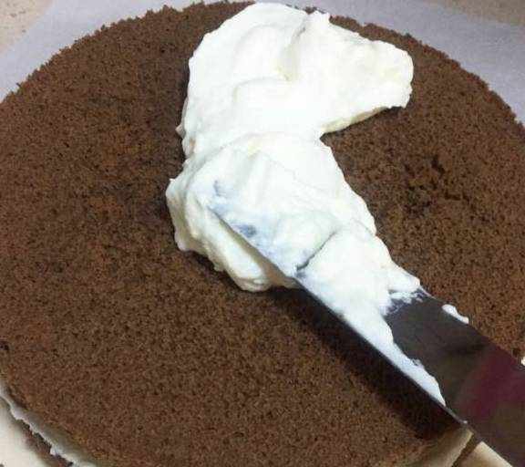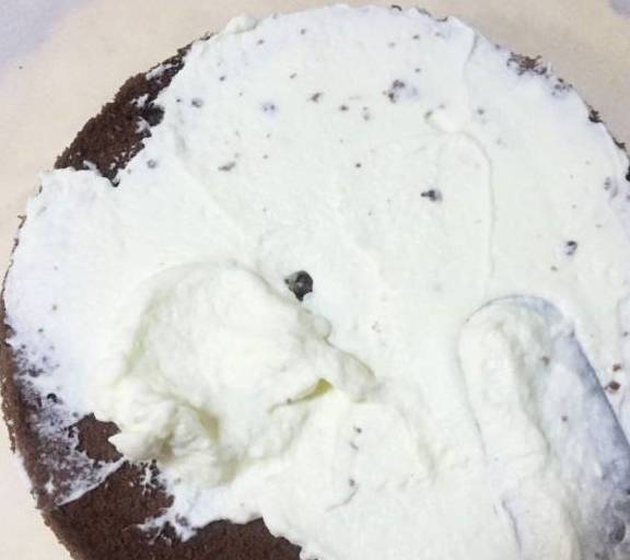 第15步、取一片戚風蛋糕片,抹上打發好的奶油