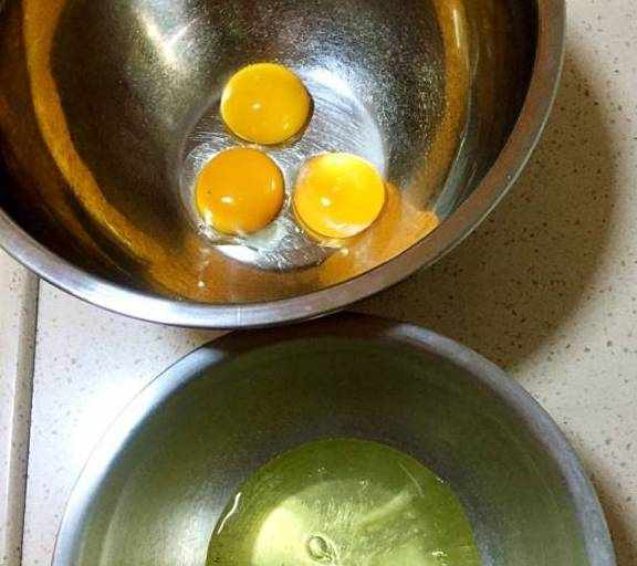 第2步、將蛋黃和蛋白分離,蛋白必須放在無油無水的的盆中,蛋白裡不要混入蛋黃,否則不好打發。
