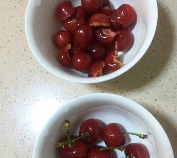 第14步、櫻桃留部分完整的,其餘去核切半